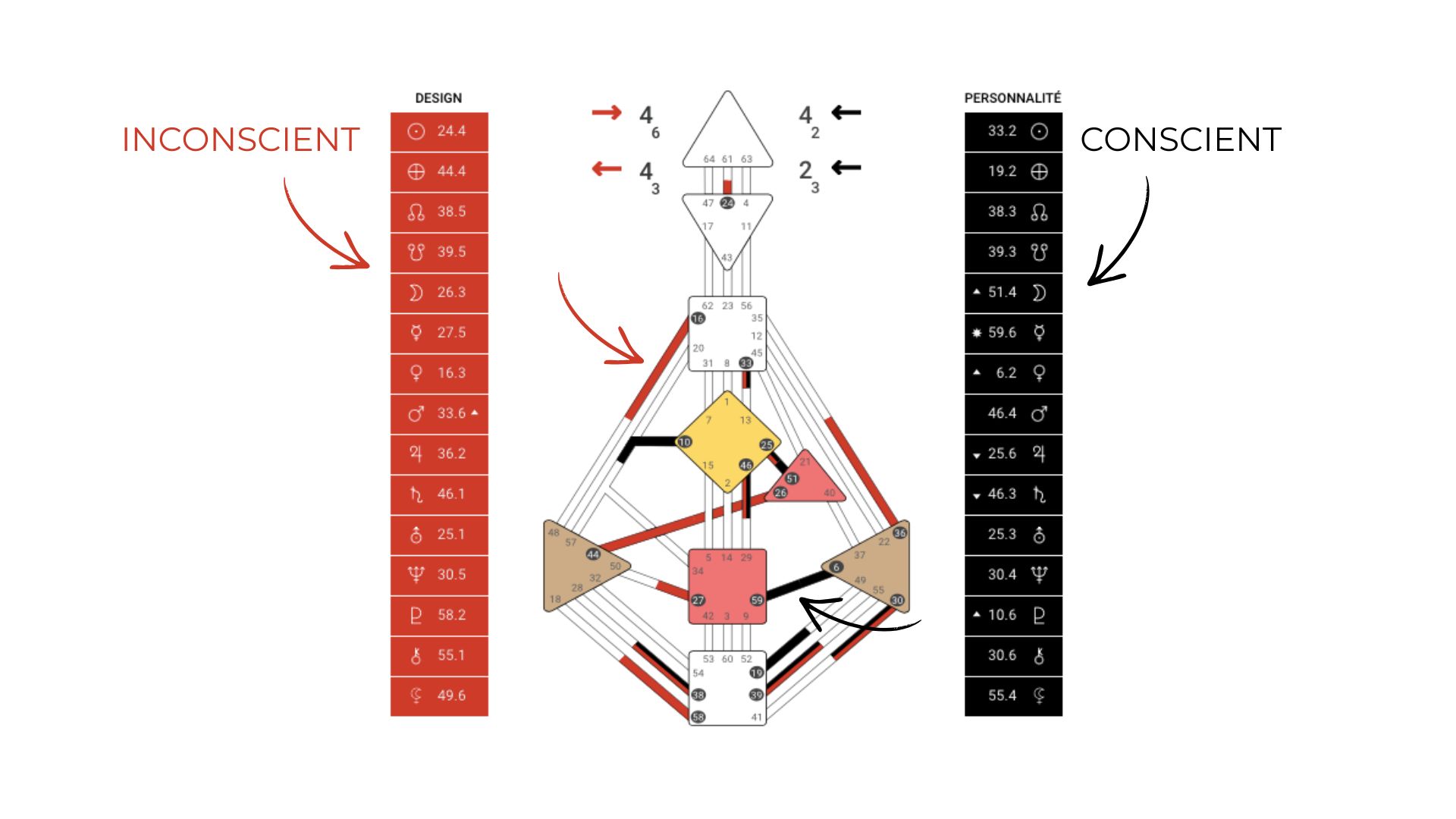Chaque porte dans votre bodygraphe est activée par une planète, en noir ou en rouge.